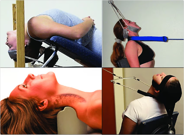 - Seated Extension Traction: This is the cornerstone of the correction. Patients used a weighted pulley system (illustrated above) to apply a consistent extension force to the neck for 10–15 minutes per session, inducing “creep” deformation in the ligaments to reshape the spinal