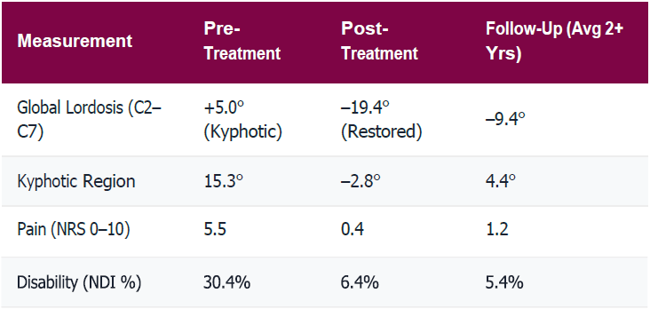 “While the CBP® protocols successfully reduced cervical kyphosis and improved symptoms, radiographic screening is critical for follow-up because structural regression may occur even when patient-reported symptoms remain stable. Maintenance treatments at approximately twice per month are likely necessary to preserve structural gains.”